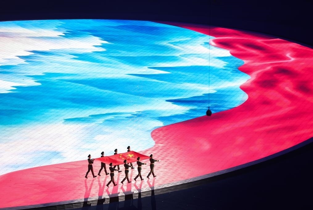 地屏上,一幅紅綢飛掠壯麗河山。8名儀仗兵步伐鏗鏘,護旗入場?!拔覑勰阒袊?,我愛你春天蓬勃的秧苗……”動人的贊歌深情唱響。
