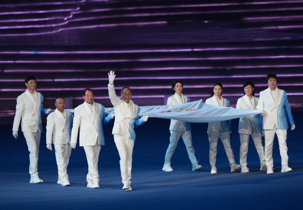 音樂響起,8名中國運動員、教練員代表共執(zhí)亞奧理事會會旗入場。伴隨著亞奧理事會會歌,會旗緩緩上升,在杭州高高飄揚。