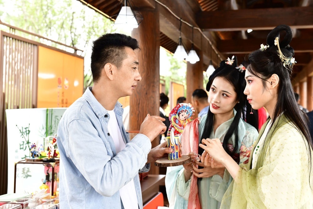 2023年9月26日,在第九屆尼山世界文明論壇“山東手造”精品展區(qū),與會(huì)人員在介紹國(guó)家級(jí)非遺曹州面人作品。新華社記者 郭緒雷 攝