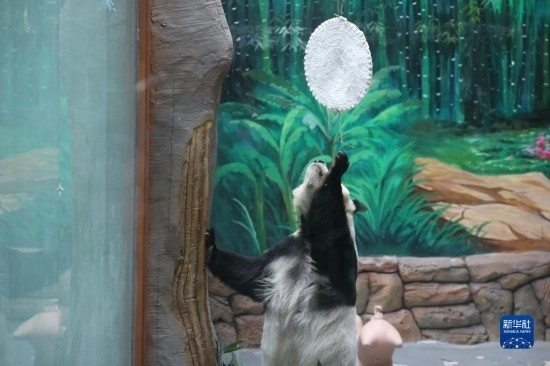 9月29日,西寧熊貓館的一只大熊貓站立起來,試圖抓取館內(nèi)裝飾的“圓月”。