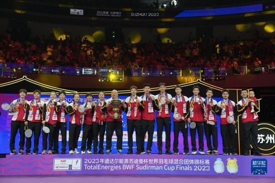 5月21日,2023年蘇迪曼杯世界羽毛球混合團(tuán)體錦標(biāo)賽頒獎(jiǎng)儀式在江蘇省蘇州市舉行。中國隊(duì)在決賽中以3比0戰(zhàn)勝韓國隊(duì),奪得冠軍。圖為中國隊(duì)在頒獎(jiǎng)儀式上慶祝。新華社記者 杜宇 攝