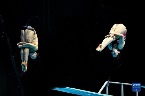 7月18日,中國(guó)選手司雅杰(右)/白鈺?shū)Q在混雙三米板比賽中。