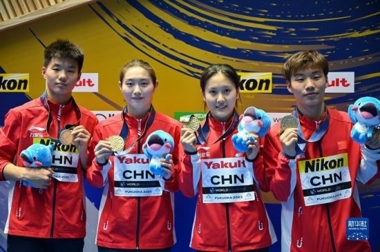 當(dāng)日,在日本福岡舉行的2023年世界游泳錦標(biāo)賽跳水混合團(tuán)體決賽中,中國(guó)隊(duì)以489.65分奪冠。