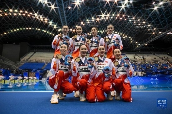 7月21日,中國(guó)隊(duì)在頒獎(jiǎng)儀式后合影。當(dāng)日,在日本福岡舉行2023年世界游泳錦標(biāo)賽花樣游泳集體自由自選決賽中,中國(guó)隊(duì)以329.1687分的成績(jī)獲得冠軍。新華社記者 夏一方 攝