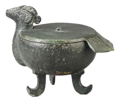 三足羊首銅尊由蓋和器身兩部分組成。蓋呈圓形扁平狀,正中間置一橋型小鈕,邊緣一段半圓弧形豁口卡住羊頸部,另一端向外延伸,略呈扇形并下斜,象征羊尾。腹身一側(cè)外凸成羊頸狀,口沿上部鑄成羊首,頸與尊腹相連。此尊造型生動(dòng)、獨(dú)特,在同類器物中實(shí)屬罕見,是安徽楚文化博物館7件“鎮(zhèn)館之寶”之一。