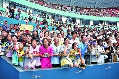 9月29日,杭州亞運(yùn)會網(wǎng)球女子單打決賽現(xiàn)場,觀眾在歡呼。本報(bào)記者陳城攝 光明圖片