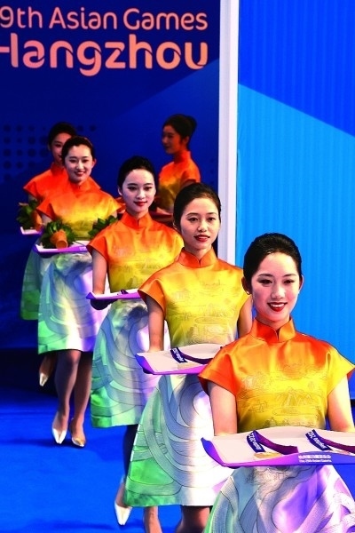 9月30日,亞運(yùn)會跳水項(xiàng)目頒獎儀式上,禮儀人員手托裝有獎牌的托盤,面帶笑容走向頒獎臺。本報(bào)記者 楊震攝/光明圖片