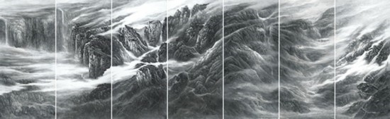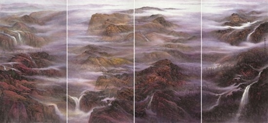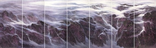 且看樂震文的《直上浮云》《云卷云舒》和《黃土馳風(fēng),日月星辰》,那逶迤茫茫的群山峻嶺,那縱橫畫面的云蒸霞蔚,那連綿不絕的箭樓城堞,哪里還是傳統(tǒng)文人山水畫的淡煙輕嵐,縹緲冷逸?濃縮于畫內(nèi)的精神意蘊(yùn),分明凸顯了現(xiàn)代山水畫對(duì)家國情懷的抒發(fā)。且讀張弛的《云起疊嶂》《惟余莽莽》和《紫氣氤氳》,那天光紫氣的浩渺煙云,那渾然一體的山水氣象,那千回百轉(zhuǎn)的流水飛泉,其實(shí)早已脫離了對(duì)自然山水的寫照,而是她感悟的時(shí)代精神在偌大畫面上的縱橫揮寫、主觀臆造。