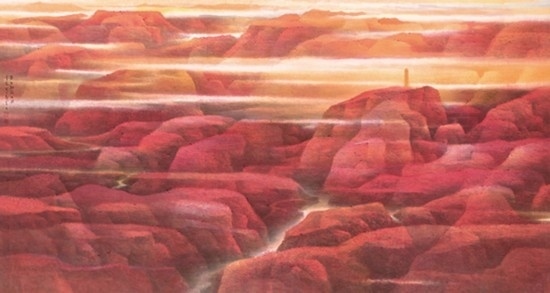 來自上海并深受海派畫學(xué)影響的樂震文、張弛,在宋元及明清山水畫學(xué)上打下了深厚的功底,也因此,他們的傳統(tǒng)山水畫深受日本民眾的歡迎。他們?cè)尉訓(xùn)|瀛多年,轉(zhuǎn)道再度研習(xí)了中國傳統(tǒng)文人畫。但真正改變他們畫風(fēng)的,卻是他們對(duì)中國北方大山大水的寫生攬勝。他們鐘情于英雄的太行山,忘情于革命勝地陜北高原,力求通過壯闊雄渾的山巒、連綿逶迤的群峰來表達(dá)他們的時(shí)代感悟,營構(gòu)儲(chǔ)存于他們胸中的山川氣象。所謂“山河回聲”,正是這些作品抒發(fā)的中華民族歷經(jīng)歲月風(fēng)華在大好河山之中回響的奮斗激情。