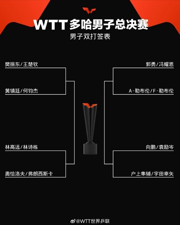 男雙選手分別是:樊振東/王楚欽、張禹珍/林仲勛、宇田幸矢/戶上隼輔、林高遠(yuǎn)/林詩棟、艾利克斯· 勒布倫/費利克斯·勒布倫、帕特里克·弗朗西斯卡/迪米特里·奧恰洛夫、莊智淵/林昀儒、黃鎮(zhèn)廷/何鈞杰。