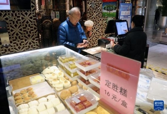 1月9日,在黃河路上的老字號點(diǎn)心店杏花樓,市民在選購劇中的同款點(diǎn)心定勝糕。新華社記者 劉穎 攝
