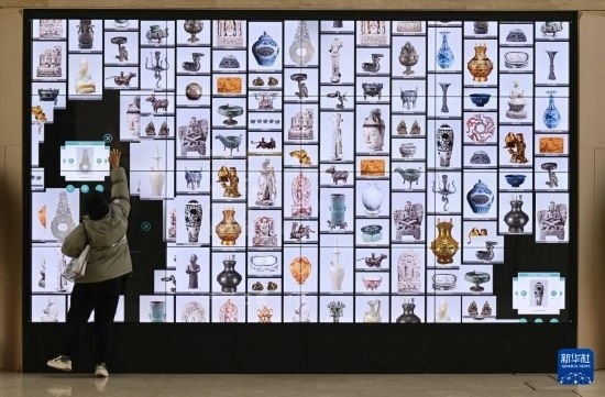 1月12日,游客在位于石家莊市的河北博物院參與互動游戲。