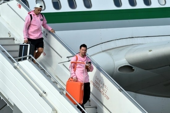 2月2日,梅西與其效力的邁阿密國際隊(duì)抵達(dá)香港國際機(jī)場,圖為梅西(右)與蘇亞雷斯走下舷梯。新華社記者 盧炳輝 攝