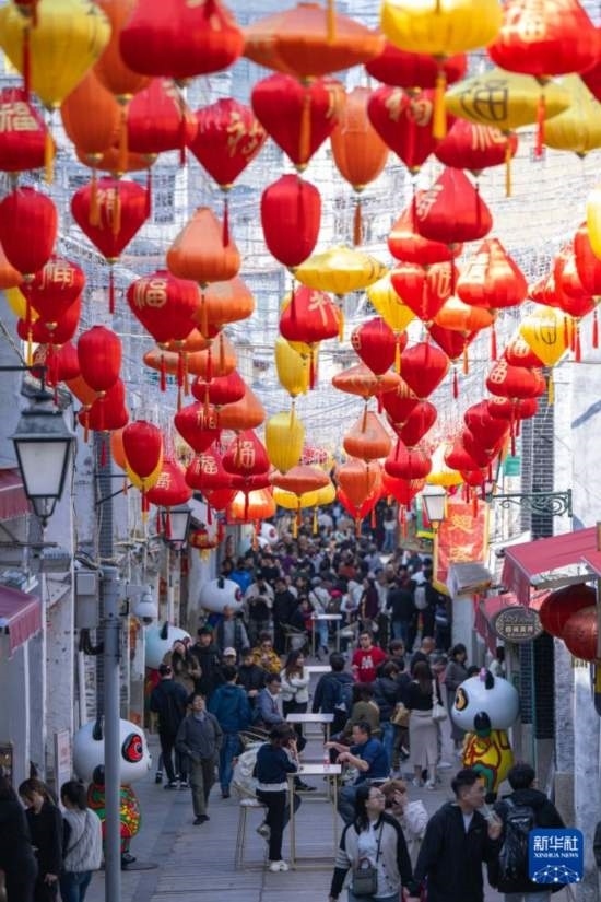 2月12日,旅客在澳門福隆新街游覽。