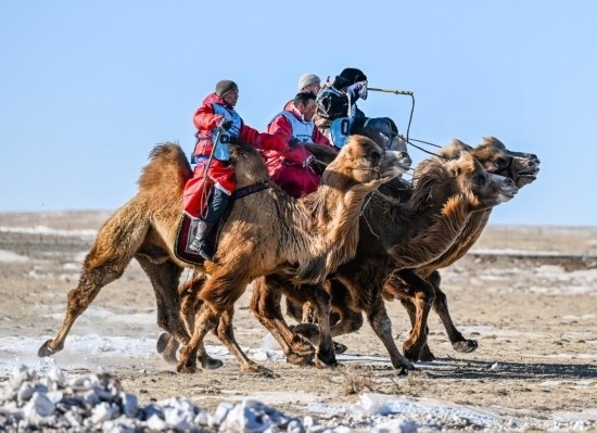茫茫草原能賽馬,茫茫沙漠就能賽駱駝。2023年底在阿拉善右旗舉行的阿拉善萬(wàn)峰駝那達(dá)慕大會(huì)上,設(shè)置了駱駝短距離速度賽、長(zhǎng)距離耐力賽、接力賽等,還有駝球表演賽。按照當(dāng)?shù)啬撩竦恼f(shuō)法,賽駱駝就得在冬天,因?yàn)槎斓鸟橊勛钇痢?/p>