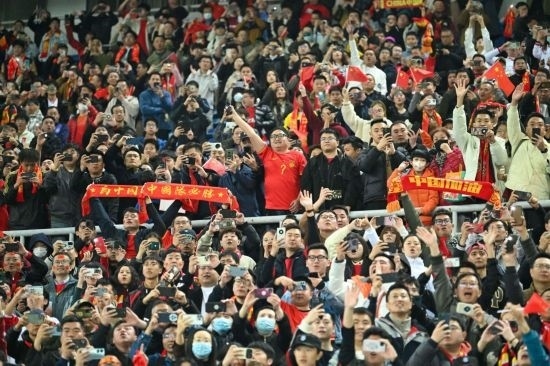 據(jù)主辦方介紹,天津奧體中心體育場(chǎng)的球票基本銷售一空,有42977名觀眾到場(chǎng)為中國(guó)隊(duì)助威。比賽在晚上8點(diǎn)開球,結(jié)束已是10點(diǎn)左右。初春夜晚加之冷風(fēng),寒意十足,但球迷的熱情和助威貫穿全程。
