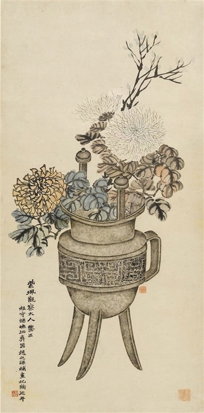 圖為清代趙之謙、程守謙中國(guó)畫《菊花博古圖軸》,上海博物館藏。