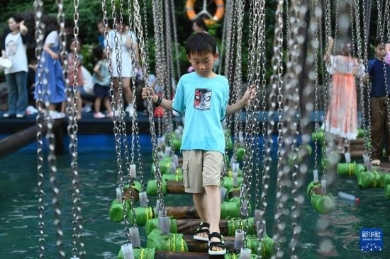 7月5日,小朋友在杭州宋城景區(qū)體驗(yàn)水上游樂項(xiàng)目。