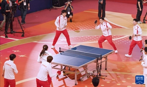 8月30日,乒乓球隊六位冠軍選手進(jìn)行乒乓球表演。