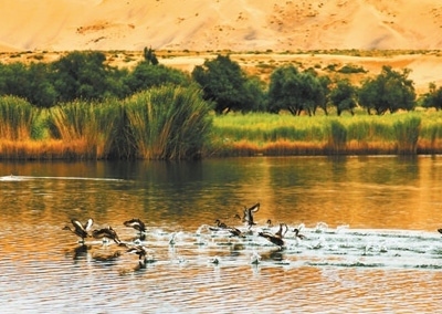 鳥(niǎo)兒在巴丹吉林沙漠中的海子里嬉戲。內(nèi)蒙古阿拉善右旗融媒體中心供圖