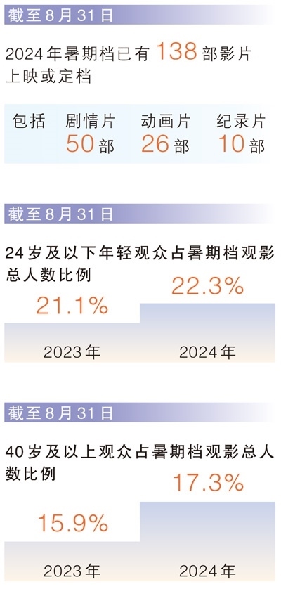 根據(jù)國(guó)家電影局統(tǒng)計(jì),2024年中國(guó)電影暑期檔(6月1日—8月31日)全國(guó)電影票房為116.43億元,觀影人次為2.85億,國(guó)產(chǎn)影片票房為84.81億元,占比為72.84%。2024年暑期檔上映、定檔百余部影片,既有國(guó)產(chǎn)片也有進(jìn)口片,涵蓋劇情片、動(dòng)畫片、紀(jì)錄片等,題材、類型、樣式、風(fēng)格多樣,開拓了審美空間,力圖滿足不同年齡、不同地域、不同性別觀眾的多樣化觀影需求。