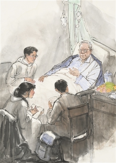 人民教師勤學篤行、求是創(chuàng)新的躬耕態(tài)度,給無數(shù)人以榜樣的力量,也給美術(shù)創(chuàng)作以靈感?!叭嗣窠逃摇眹覙s譽稱號獲得者衛(wèi)興華,終其一生都奮斗在勤學求真的道路上。90余歲時,即使病痛纏身,他仍堅持每天學習、工作。有感于衛(wèi)興華教授的敬業(yè)精神,高毅特意描繪了臥病在床的衛(wèi)興華堅持與學生探討學術(shù)課題的場景,主人公那專注的神情令人動容。像衛(wèi)興華這樣堅守耕耘的教師還有許多。劉昌明水彩畫《一個教師的工作臺》便以細致的場景描繪表達出對教師群體的敬意。貼著泛黃舊紙的墻面、藥瓶和墨水瓶之間的教案、脫漆的木桌、一副老花眼鏡……畫家在此調(diào)動了一切能夠反映老一輩教育者辛勤伏案的元素,象征著沒有直接出場的教師形象。“此處無聲勝有聲”的表達效果,令人回味無窮。