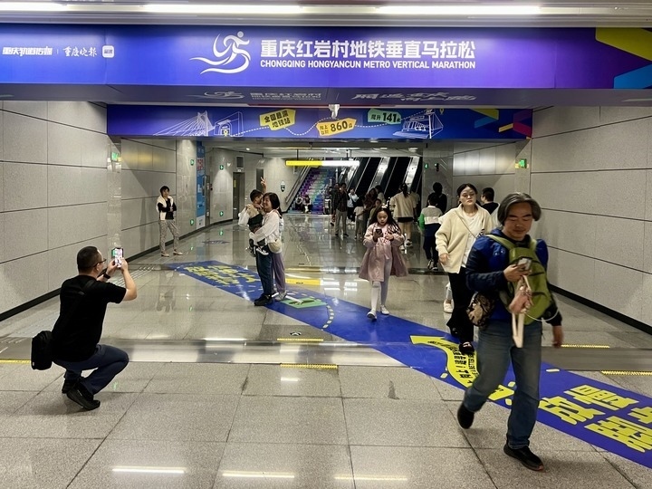 國(guó)慶前夕,這里剛舉辦了一場(chǎng)垂直馬拉松。賽事帶來(lái)品牌效應(yīng),前來(lái)打卡的人群絡(luò)繹不絕。“垂直馬拉松一般在摩天大樓里舉辦,如今地鐵站里居然能跑馬拉松,重慶總是能給游客帶來(lái)驚喜?!眮?lái)自河北的游客張楠說(shuō)。