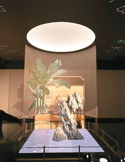步入上海博物館東館最新開(kāi)放的“中國(guó)歷代書法”展廳,觀眾會(huì)立刻沉浸于一種雅致、古典的氛圍。序廳正中立著一尊太湖石雕塑,上方的燈光宛如一輪圓月,石后的幕布上繪著一樹芭蕉,石下的LED屏幕顯出一汪碧色湖水,伴著間或響起的水滴聲,蕩起漣漪。