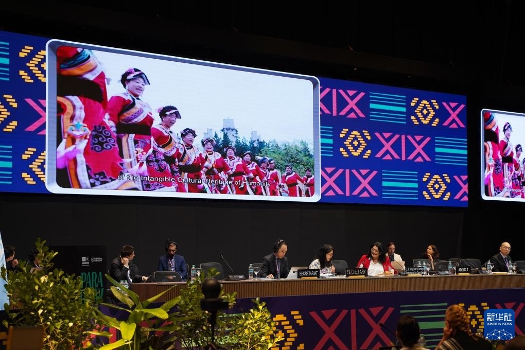 12月5日,在巴拉圭亞松森聯(lián)合國教科文組織保護非物質(zhì)文化遺產(chǎn)政府間委員會第19屆常會評審現(xiàn)場,大屏幕播放“中國木拱橋傳統(tǒng)營造技藝”宣傳視頻。新華社記者 朱雨博 攝