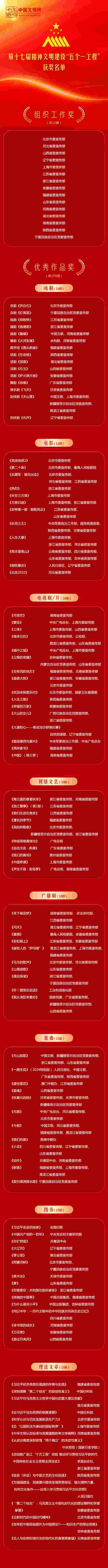 近日,中共中央宣傳部印發(fā)表彰決定,對第十七屆精神文明建設(shè)“五個一工程”組織工作先進單位和優(yōu)秀作品進行表彰。授予《齊白石》等15部戲劇作品、《流浪地球2》等12部電影作品、《問蒼茫》等16部電視作品、《陶三圓的春夏秋冬》等10部網(wǎng)絡(luò)文藝作品、《禾下乘涼夢》等10部廣播劇、《天山放歌》等12首歌曲,共105部作品“優(yōu)秀作品獎”;授予北京、河北、山西、遼寧、上海、江蘇、浙江、安徽、福建、山東、河南、湖北、湖南、陜西、寧夏等15個省區(qū)市黨委宣傳部“組織工作獎”。