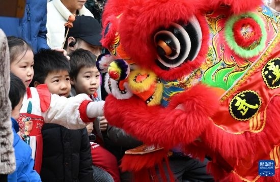 1月19日,小朋友在社區(qū)廟會上和舞獅互動。