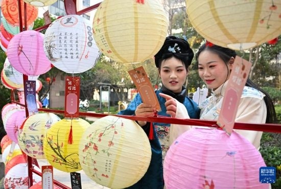 1月19日,身著漢服的居民在社區(qū)廟會上猜燈謎。