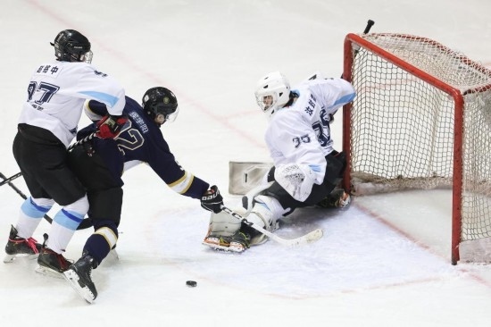 2024年12月8日,北京京獅男子冰球隊(duì)球員侯宇陽(yáng)(中)在2024-2025賽季中國(guó)男子冰球職業(yè)聯(lián)賽(齊齊哈爾站)比賽中射門(mén)。新華社記者 張濤 攝