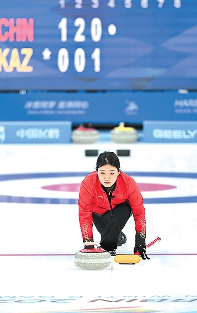 中國隊(duì)選手韓雨在亞冬會冰壺混雙比賽中擲壺。