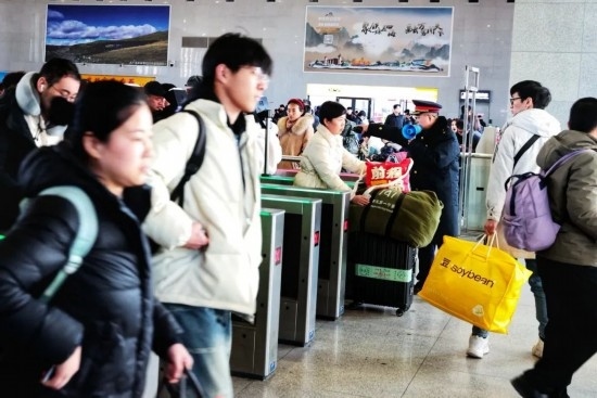 2月5日迎來返程高峰,邯鄲站內(nèi)的旅客依次檢票進站。
