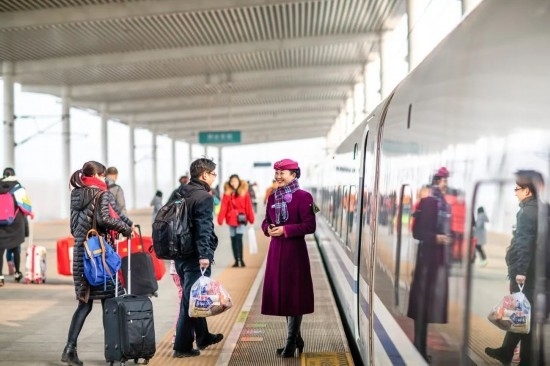 2月10日,高鐵乘務(wù)員立崗接送列車。