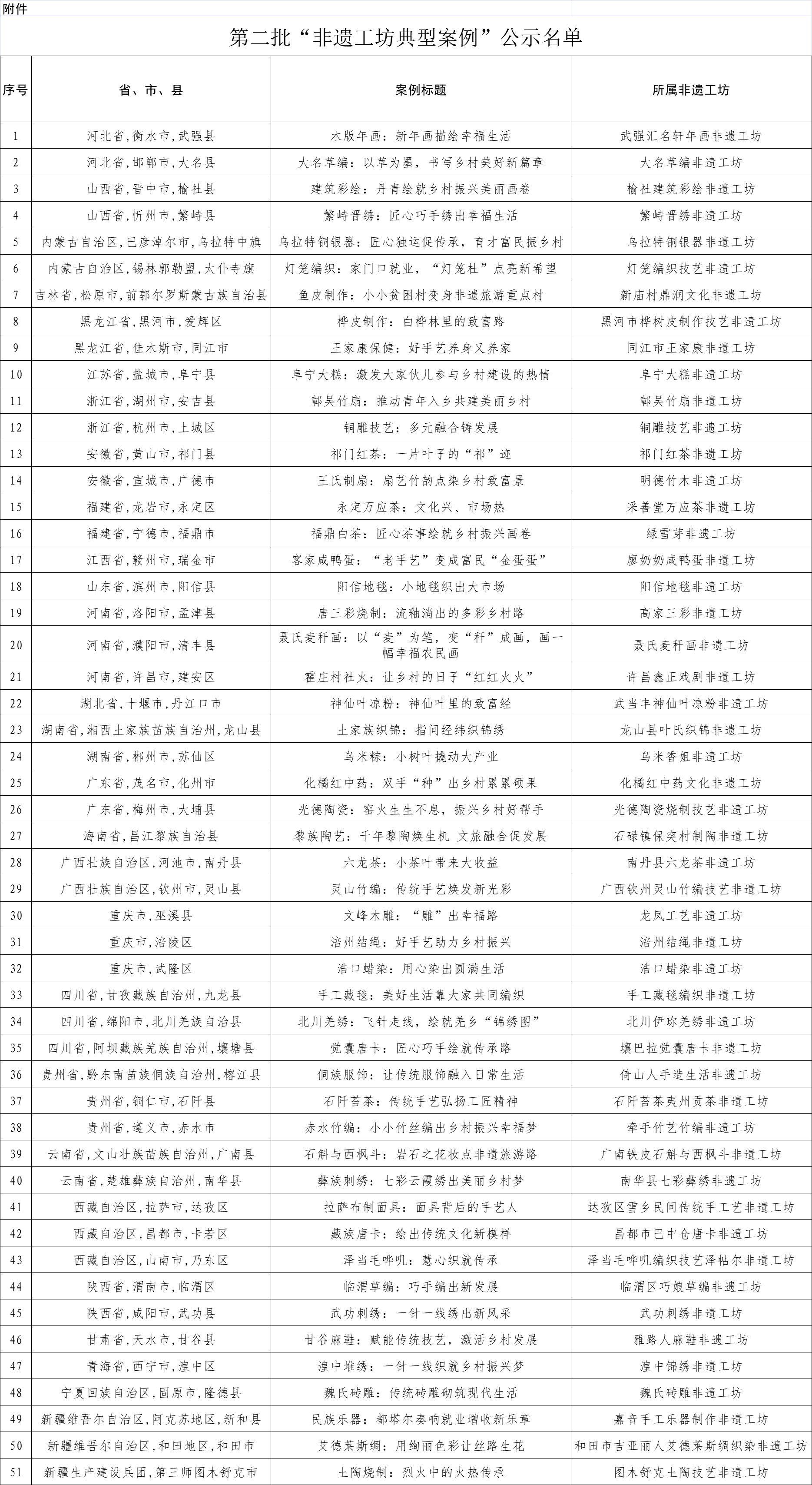 人民網(wǎng)北京3月19日電 (記者楊虞波羅)根據(jù)《文化和旅游部辦公廳 人力資源社會(huì)保障部辦公廳 農(nóng)業(yè)農(nóng)村部辦公廳關(guān)于推薦第二批“非遺工坊典型案例”的通知》,經(jīng)各省推薦和專家評(píng)議,第二批“非遺工坊典型案例”推薦和遴選工作于日前結(jié)束。現(xiàn)將推薦名單進(jìn)行公示。