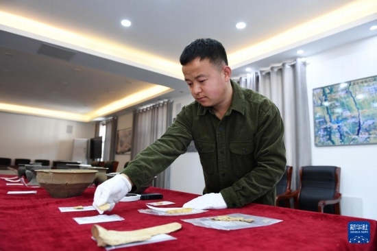 2025年2月25日,在位于陜西省寶雞市的周原田野考古中心,陜西省考古研究院研究實習員閆永強在整理周原遺址出土文物。新華社記者 李一博 攝