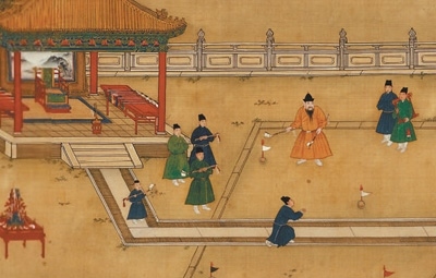 捶者,打也;丸者,球也。“不少學(xué)生剛接觸捶丸時,說它像現(xiàn)代的高爾夫。其實,捶丸比高爾夫運動歷史更悠久?!逼巾斏綄W(xué)院陶瓷學(xué)院院長梅國建介紹,捶丸源自唐代擊鞠(馬球)和步打球,傳至宋朝逐漸演變?yōu)橐来螕羟虻姆菍剐员荣?,名稱也變?yōu)榇吠瑁F(xiàn)藏于故宮博物院的《明宣宗行樂圖》中就描繪了宮中捶丸的場景。