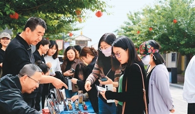 游客在六營(yíng)村欣賞泥塑作品。
