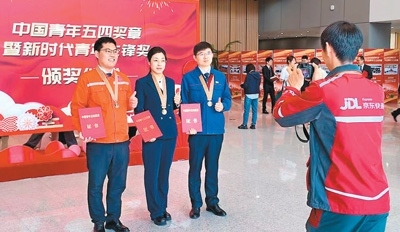 2025年4月30日,中國青年五四獎章暨新時代青年先鋒獎頒獎儀式在京舉行。趙亞杰(中)在頒獎現(xiàn)場合影留念,拍攝照片的是快遞小哥欒玉帥,他也獲得了2025年度中國青年五四獎章。