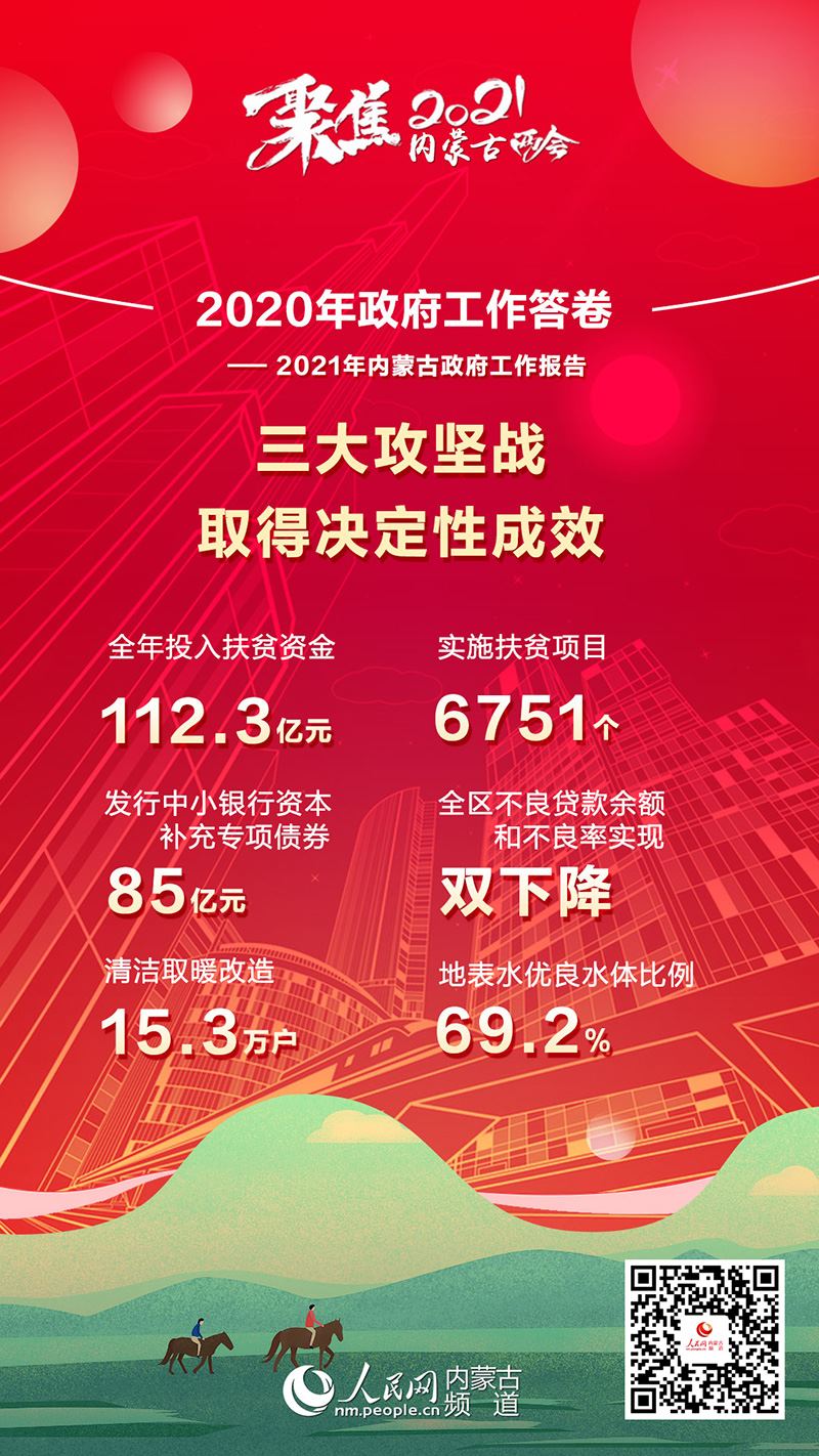 1月26日上午,內(nèi)蒙古自治區(qū)十三屆人大四次會議在內(nèi)蒙古人民會堂開幕。自治區(qū)主席布小林作政府工作報告。2020年是極不平凡的一年,內(nèi)蒙古緊扣全面建成小康社會目標(biāo)任務(wù),堅持穩(wěn)中求進工作總基調(diào),堅持以人民為中心,科學(xué)統(tǒng)籌疫情防控和經(jīng)濟社會發(fā)展,扎實做好“六穩(wěn)”工作,全面落實“六?!比蝿?wù),全區(qū)經(jīng)濟持續(xù)回穩(wěn),社會大局和諧穩(wěn)定,“十三五”規(guī)劃順利收官。2020年政府工作有哪些亮點?看內(nèi)蒙古書寫這份精彩答卷!