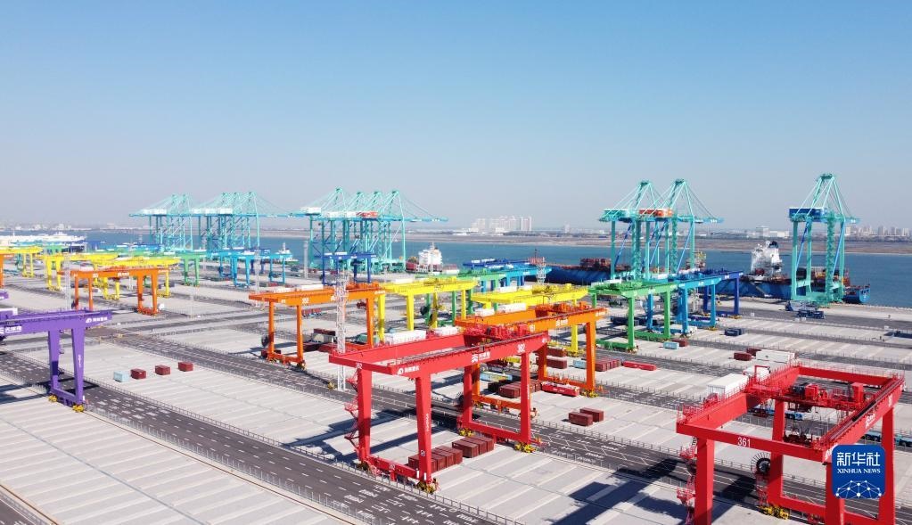這是天津港北疆港區(qū)C段智能化集裝箱碼頭(2021年10月17日攝,無(wú)人機(jī)照片)。新華社記者 趙子碩 攝