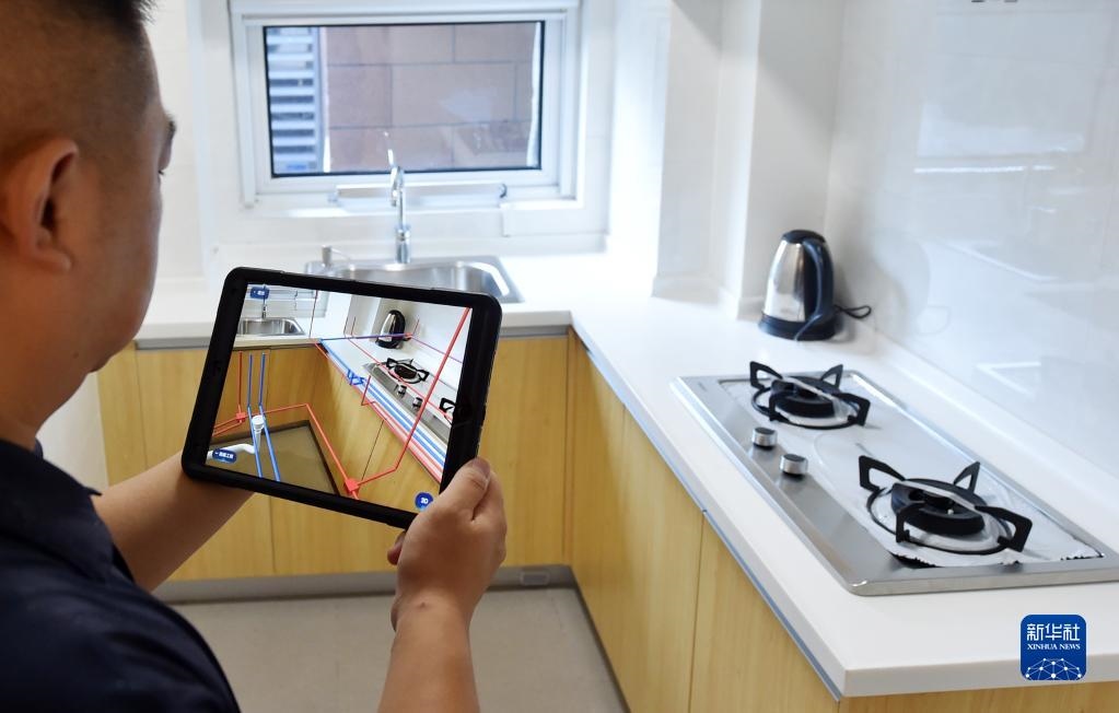 在中新天津生態(tài)城一小區(qū),小區(qū)業(yè)主通過(guò)AR房屋使用說(shuō)明書查看廚房管道線路(2020年8月13日攝)。新華社記者 趙子碩 攝