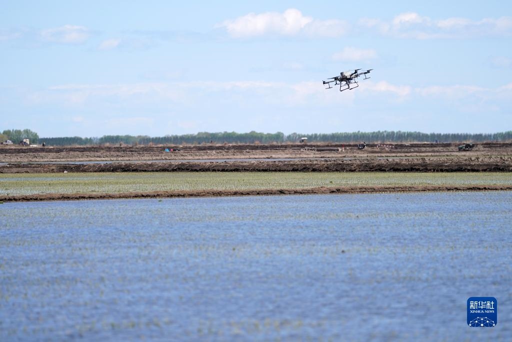 無(wú)人機(jī)在北大荒集團(tuán)七星農(nóng)場(chǎng)有限公司一塊稻田中作業(yè)(5月18日攝)。新華社記者 王建威 攝
