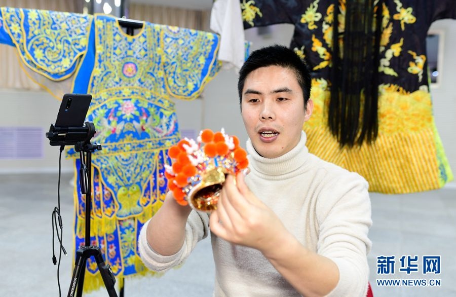 4月19日,內(nèi)蒙古婦女兒童中心少兒京劇班教師崔猛通過網(wǎng)絡(luò)直播平臺(tái)為學(xué)生介紹戲曲工藝品制作技藝。 -