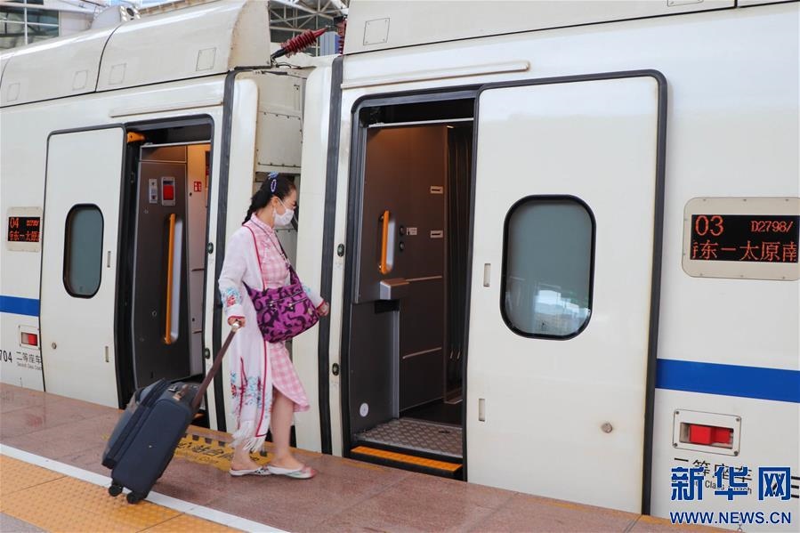 7月1日,在呼和浩特東火車站,鐵路工作人員在D2798次“和諧號”動(dòng)車組列車旁合影留念。 自7月1日起,內(nèi)蒙古呼和浩特與山西太原間首次開行動(dòng)車組列車,動(dòng)車組列車每日開行2對,兩地間客運(yùn)鐵路運(yùn)行時(shí)間由過去的近10小時(shí)縮短至最快5小時(shí)以內(nèi)。 新華社記者 朱文哲 攝