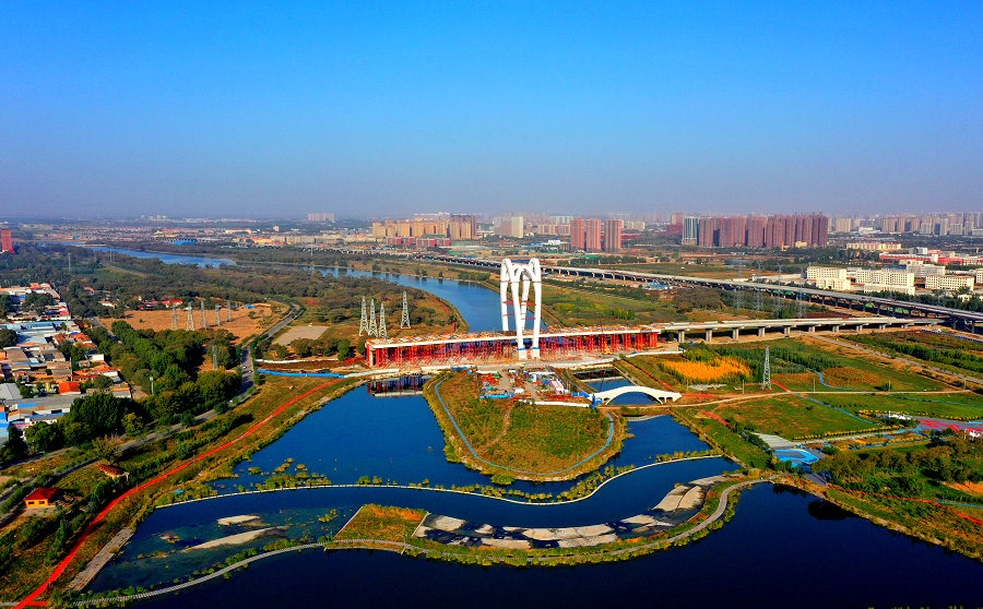 10月7日,工人正在呼和浩特市賽罕區(qū)段大黑河斜拉橋上施工。